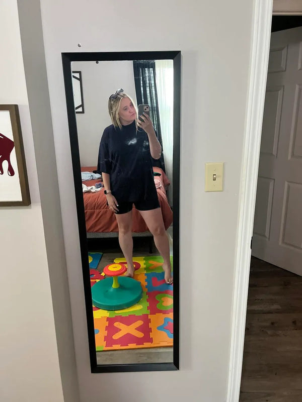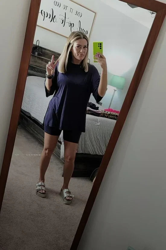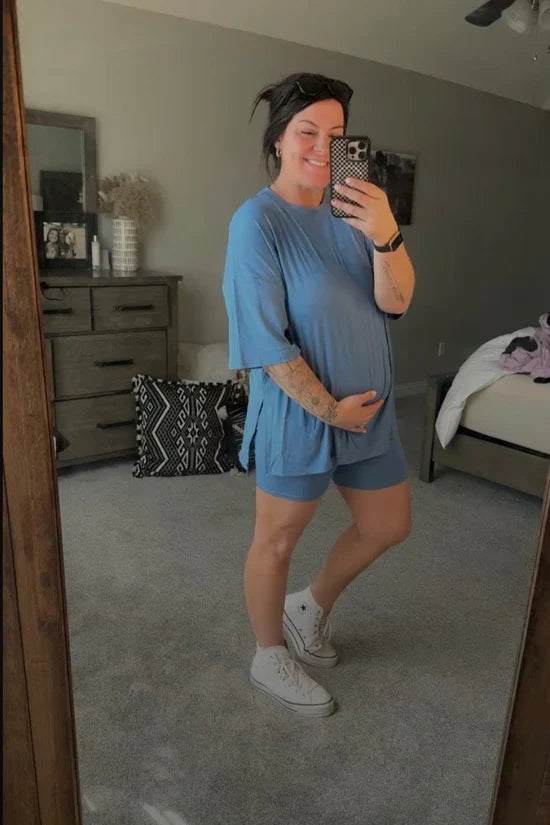 Absolutely. The high-stretch shorts and oversized shirt are perfect for bumps and beyond. It’s a favorite among expecting mamas.